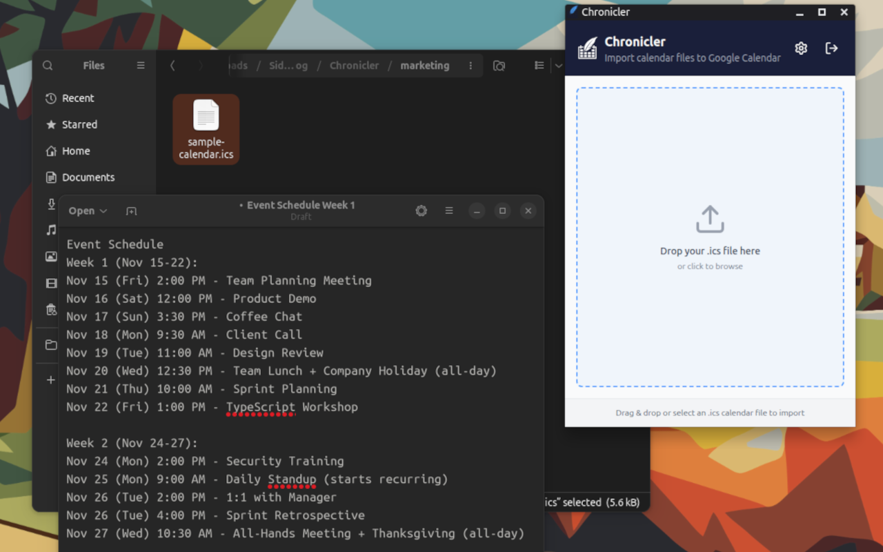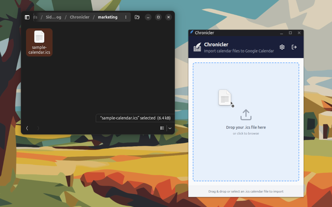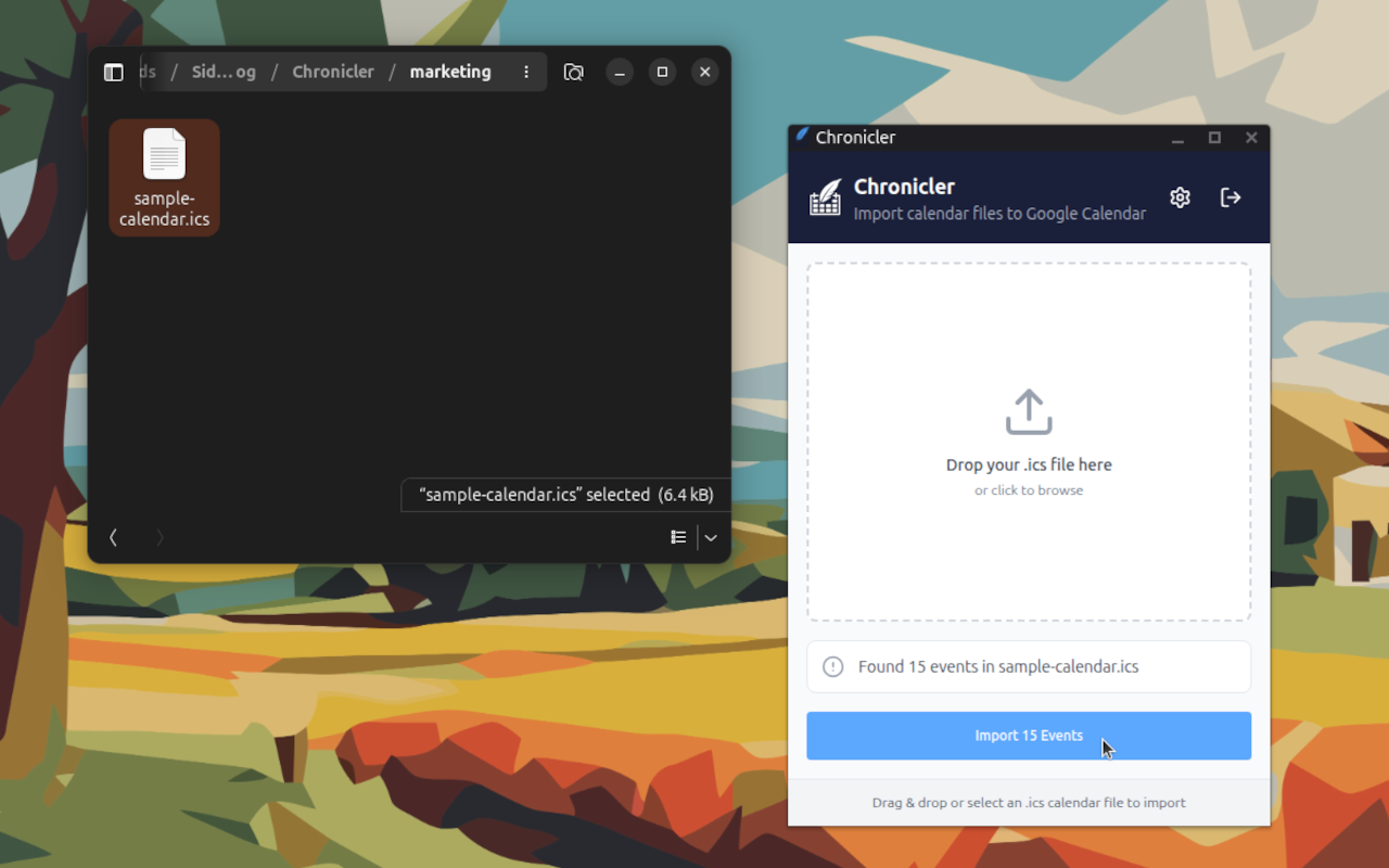 A browser extension that makes importing .ics calendar files quick and effortless. Simply drag your file, and Chronicler handles the rest.